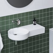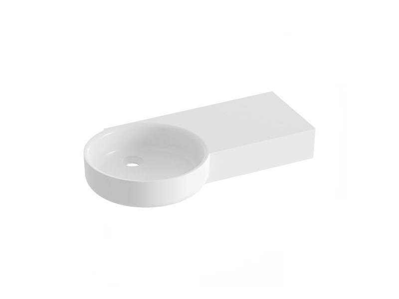 Vasque ARC 83/43 G/D avec espace de rangement à gauche ou à droite. La vasque n’est pas équipée d’un trop-plein, il est donc nécessaire d’utiliser une bonde de vasque fixe qui empêche le débordement de l’eau. Vasque conçue pour être associée avec un mitigeur encastré.