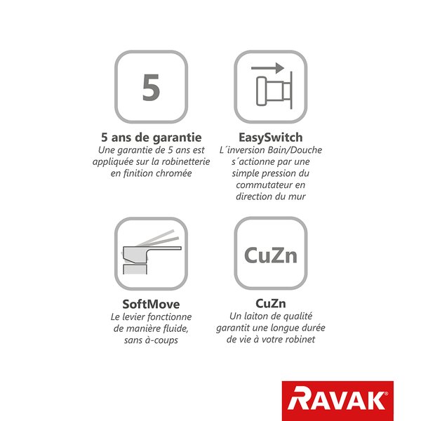 Afin d'obtenir un effet d'ensemble et de design assorti, nous vous recommandons de combiner les mitigeurs Classic avec les autres produits du concept Classic et avec d'autres accessoires de la marque RAVAK. Pour le nettoyage extérieur, nous vous recommandons d'utiliser le produit d'entretien RAVAK Cleaner Chrome. Le corps R-box RB 070.50, destiné aux mitigeurs encastrés, ne fait pas partie du mitigeur, il est donc nécessaire de l'acheter séparément. Le conditionnement du R-box comprend le matériel nécessaire à sa fixation au mur, mais ne contient pas les raccords pour la tuyauterie d'eau ni aucune autre pièce de plomberie. Le R-box comprend la pièce en plastique recouvrant le corps intérieur du mitigeur se trouvant dans le R-box et qui, lors du démontage de la partie supérieure du mitigeur, maintient le réseau de distribution d'eau de la salle de bains parfaitement fonctionnel. Cette pièce en plastique vous permettra de purger le réseau de distribution d'eau sans devoir couper l'eau. Le R-box comporte une flèche qui indique clairement la partie haute du produit, ce qui vous permettra d'orienter convenablement le corps du mitigeur.