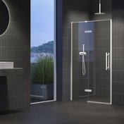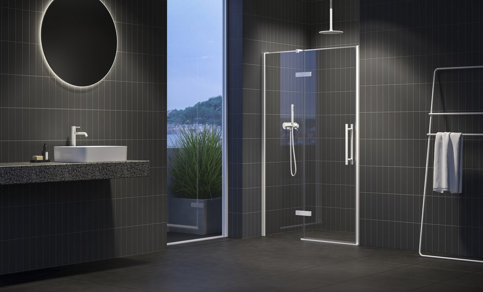 Porte de douche en deux parties Cool! en chrome brillant ou en noir. Remplissage en verre transparent avec revêtement protecteur RAVAK Anticalc®. Système d’ouverture à charnière. Produit réversible pour la variante droite et gauche. La solution idéale pour créer un espace de douche à partir d’une niche de 100 à 120 cm de large.